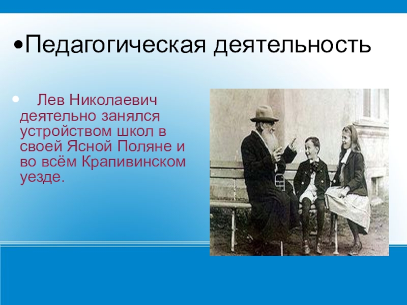 Педагогическая деятельность  Лев Николаевич деятельно занялся устройством школ в своей Ясной Поляне и во всём Крапивинском