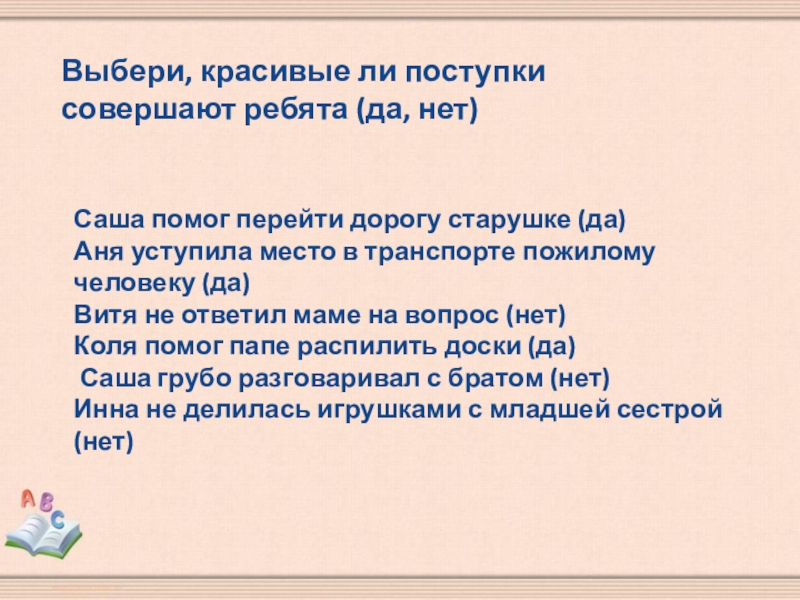 Выбери, красивые ли поступки совершают ребята (да, нет)