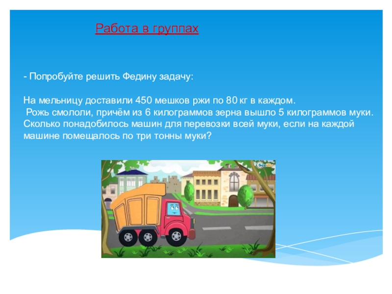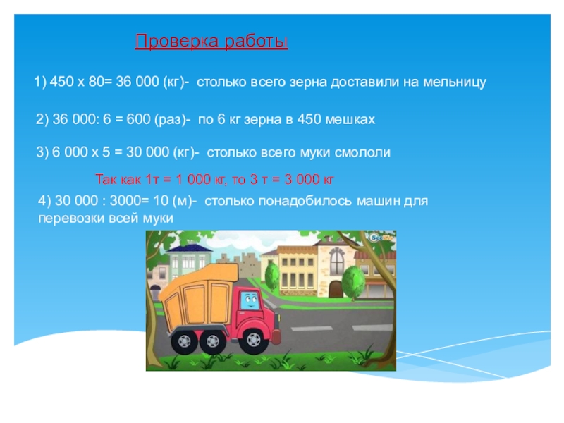 4) 30 000 : 3000= 10 (м)- столько понадобилось машин для перевозки всей муки
