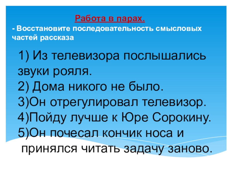 - Восстановите последовательность смысловых частей рассказа