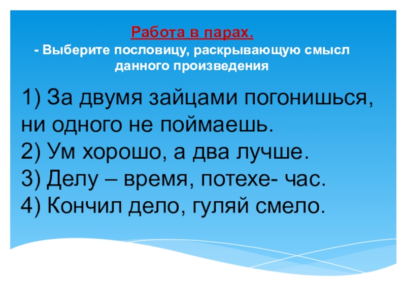 - Выберите пословицу, раскрывающую смысл данного произведения