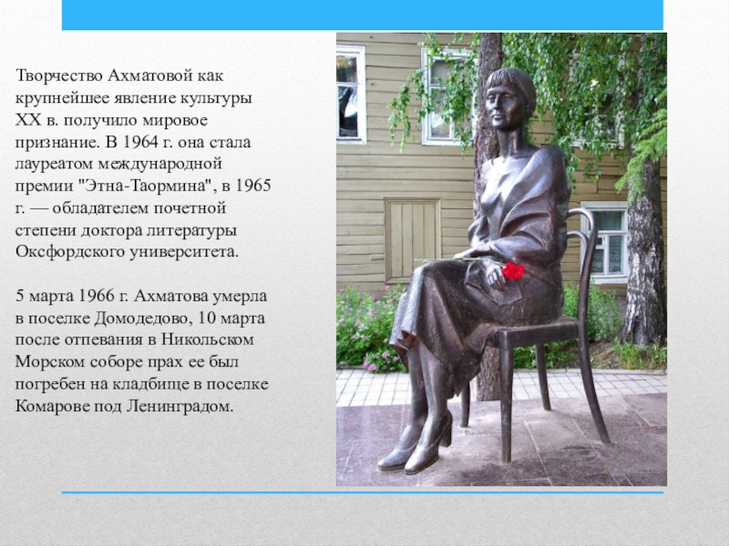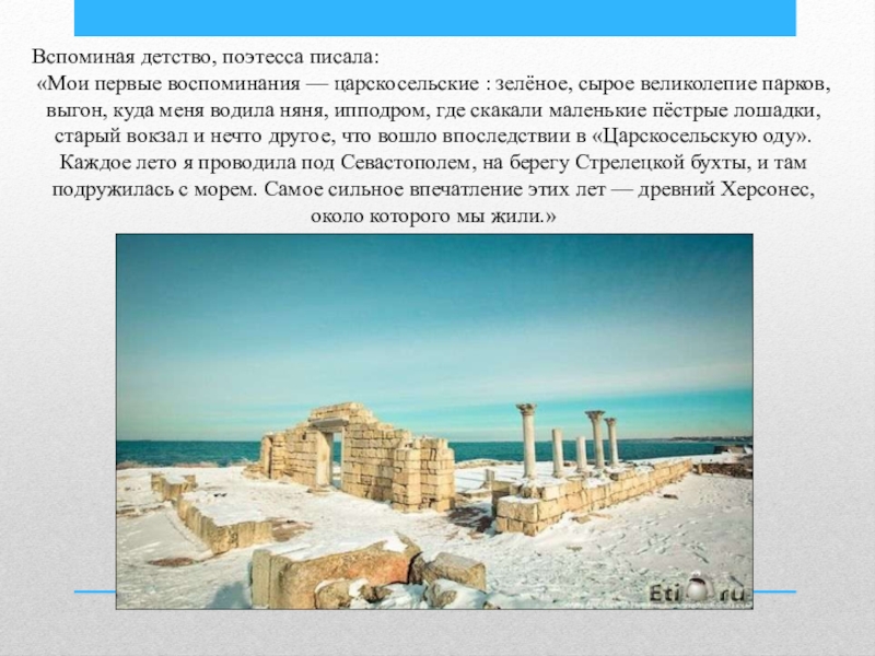 Через год после рождения дочери семья переехала в Царское Село. Здесь Ахматова стала ученицей Мариинской гимназии, но каждое лето проводила под Севастополем,