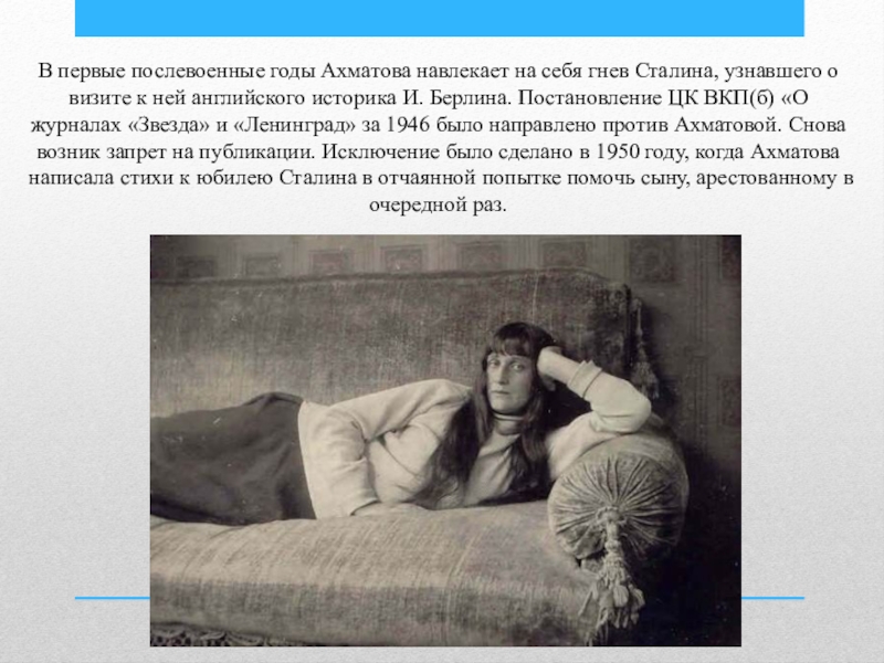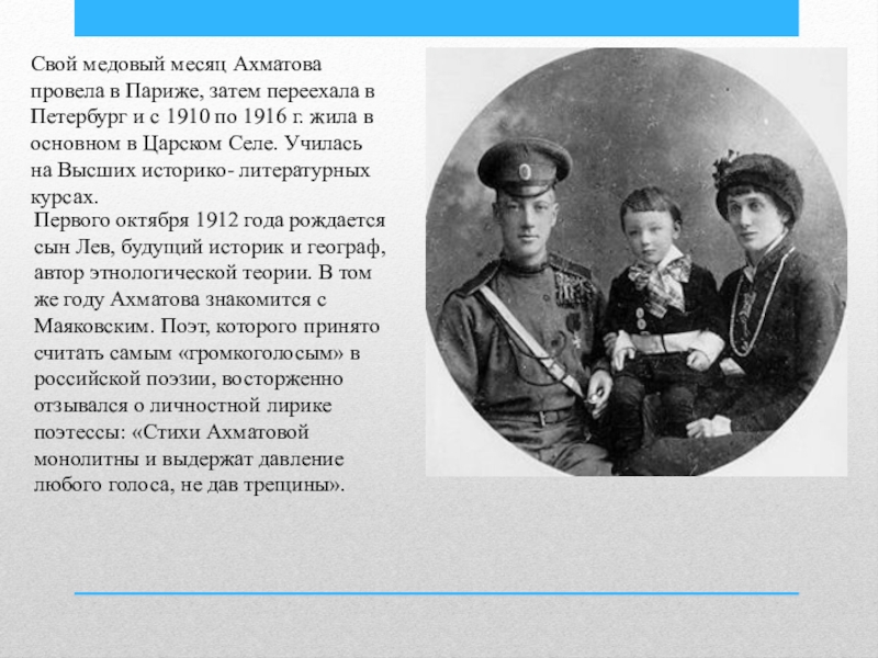 Первого октября 1912 года рождается сын Лев, будущий историк и географ, автор этнологической теории. В том же году Ахматова знакомится с Маяковским. Поэт, которого принято считать самым «громкоголосым» в российской поэзии, восторженно отзывался о личностной лирике поэтессы: «Стихи Ахматовой монолитны и выдержат давление любого голоса, не дав трещины».