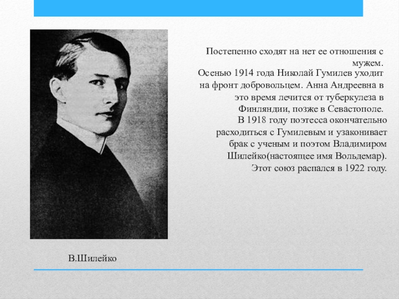 Осенью 1914 года Николай Гумилев уходит на фронт добровольцем. Анна Андреевна в это время лечится от туберкулеза в Финляндии, позже в Севастополе.
