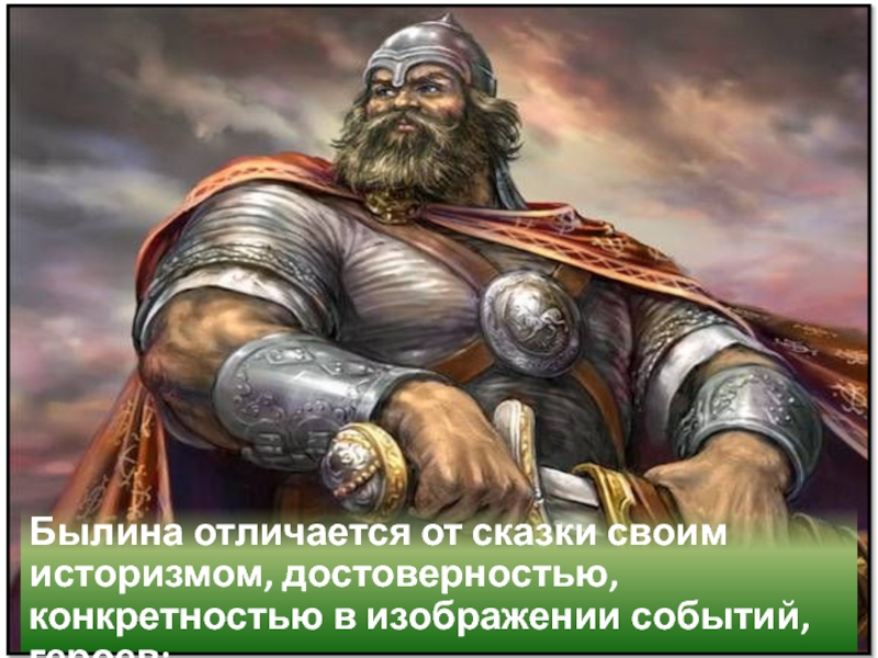 Слайд 3Былина отличается от сказки своим историзмом, достоверностью, конкретностью в изображении событий,