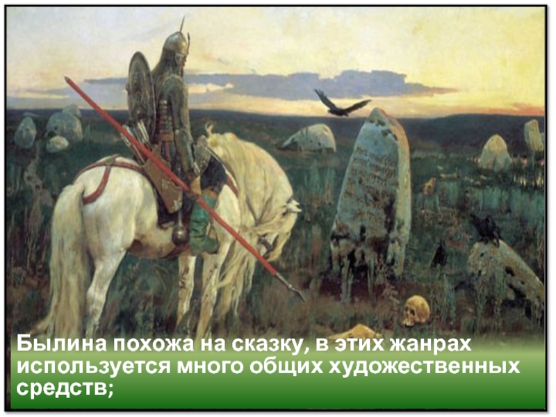 Слайд 2Былина похожа на сказку, в этих жанрах используется много общих художественных