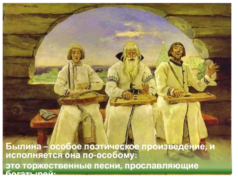 Слайд 5Былина – особое поэтическое произведение, и исполняется она по-особому: