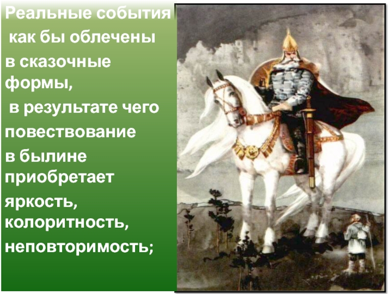 Реальные события как бы облечены в сказочные формы, в результате чего повествование в былине приобретает яркость, колоритность,