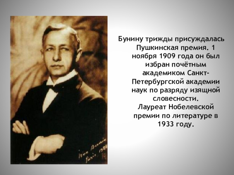 «Жизнь Арсеньева» (1927—1929, 1933) и цикл рассказов «Тёмные аллеи» (1938-40). Эти произведения стали новым словом и в бунинском творчестве, и в русской литературе в целом.
