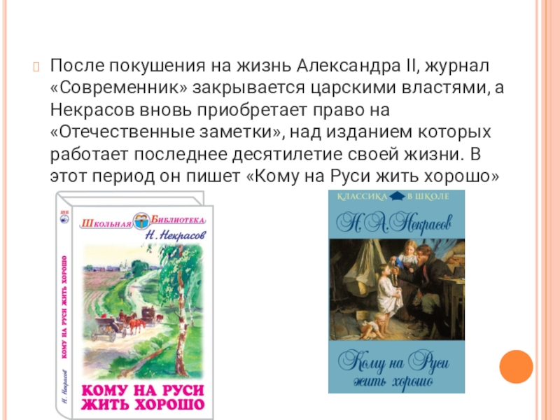 а Некрасов вновь приобретает право на «Отечественные заметки», над изданием которых работает последнее десятилетие своей жизни. В этот период он пишет «Кому на Руси жить хорошо»