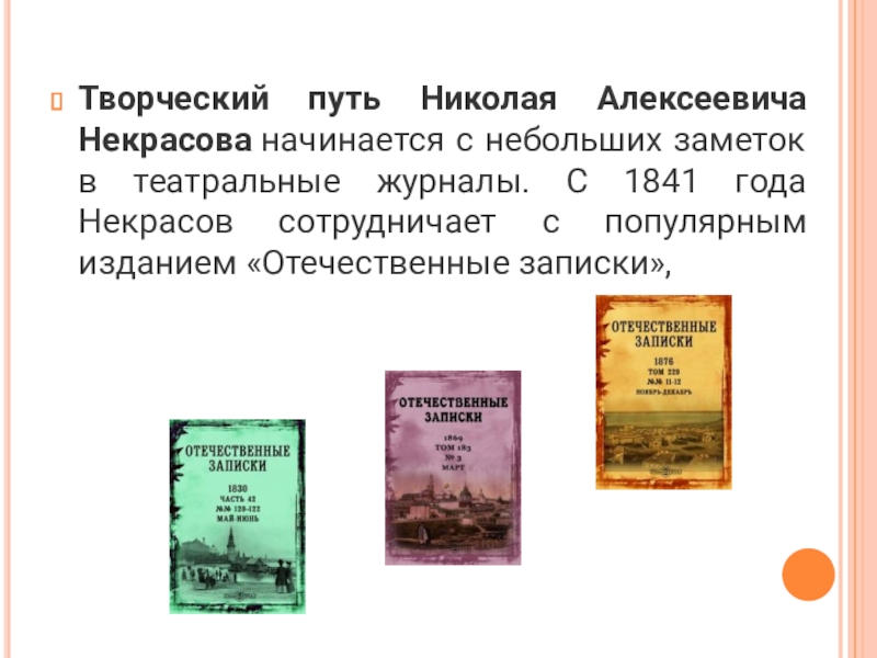Творческий путь Николая Алексеевича Некрасова начинается с небольших заметок в театральные журналы. С 1841 года Некрасов сотрудничает с