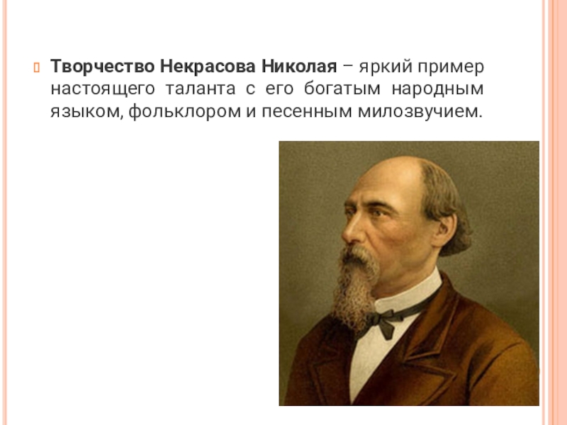 Слайд 12Творчество Некрасова Николая – яркий пример настоящего таланта с его богатым народным