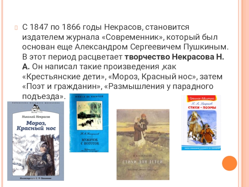 С 1847 по 1866 годы Некрасов, становится издателем журнала «Современник», который был основан еще Александром Сергеевичем Пушкиным.