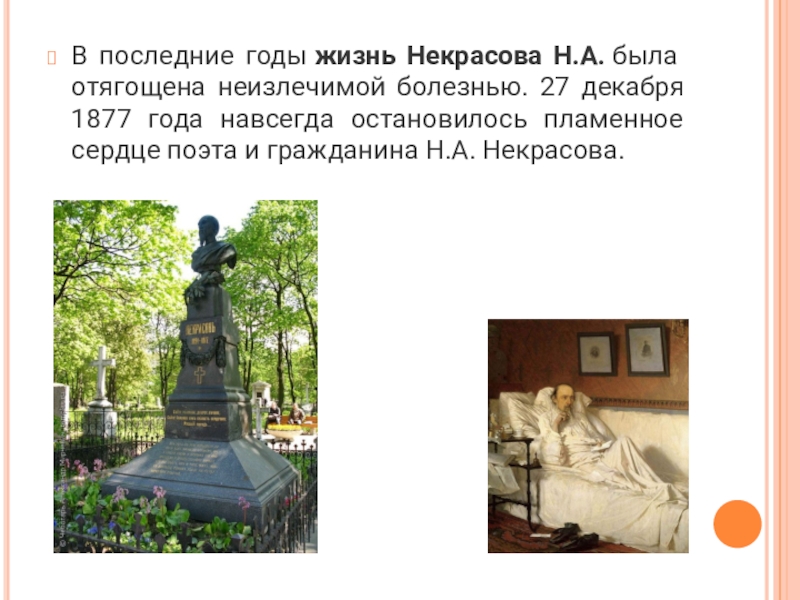 Слайд 11В последние годы жизнь Некрасова Н.А. была  отягощена неизлечимой болезнью. 27 декабря 1877