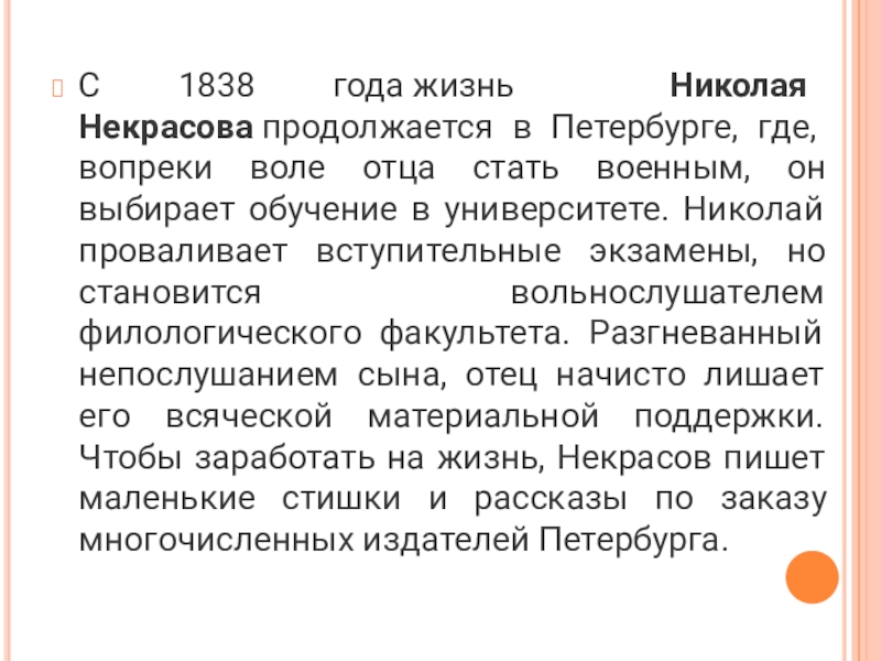 стать военным, он выбирает обучение в университете. Николай проваливает вступительные экзамены, но становится вольнослушателем филологического факультета. Разгневанный непослушанием сына, отец начисто лишает его всяческой материальной поддержки. Чтобы заработать на жизнь, Некрасов пишет маленькие стишки и рассказы по заказу многочисленных издателей Петербурга.