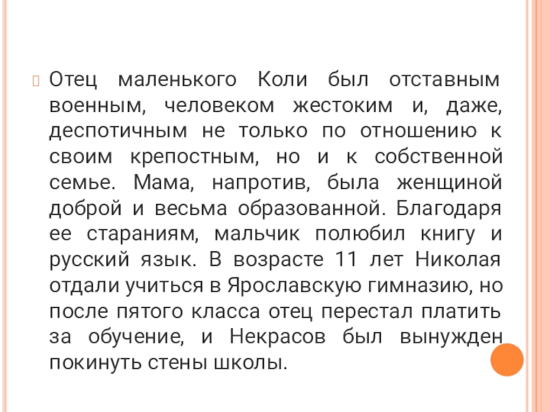не только по отношению к своим крепостным, но и к собственной семье. Мама, напротив, была женщиной доброй и весьма образованной. Благодаря ее стараниям, мальчик полюбил книгу и русский язык. В возрасте 11 лет Николая отдали учиться в Ярославскую гимназию, но после пятого класса отец перестал платить за обучение, и Некрасов был вынужден покинуть стены школы.
