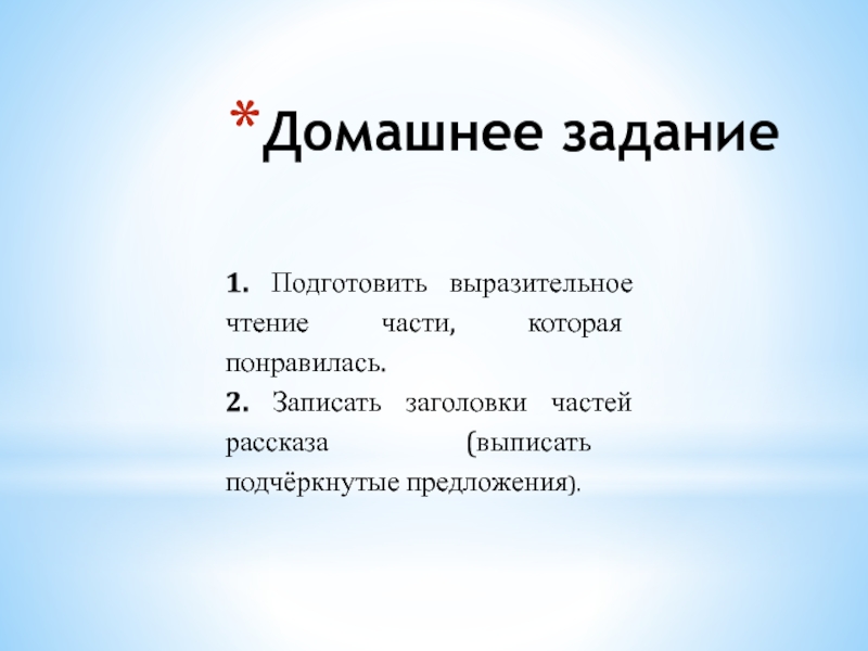 Домашнее задание1. Подготовить выразительное чтение части, которая понравилась.2. Записать заголовки частей рассказа (выписать подчёркнутые предложения).