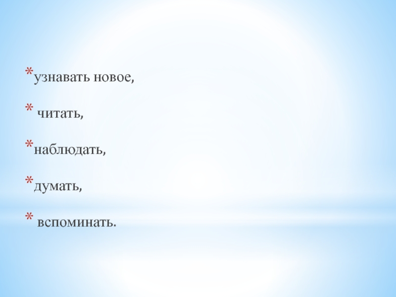 узнавать новое, читать, наблюдать,думать, вспоминать.