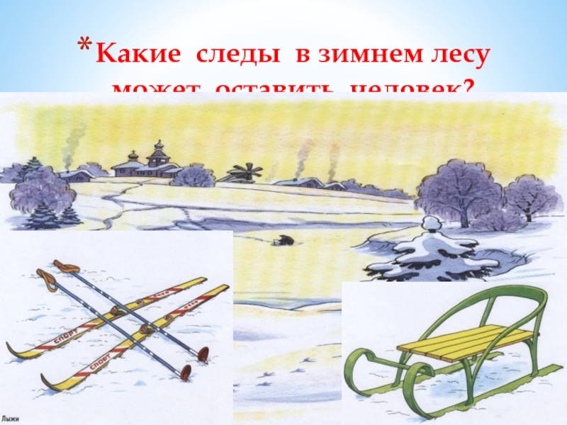 Слайд 13Какие следы в зимнем лесу может оставить человек?