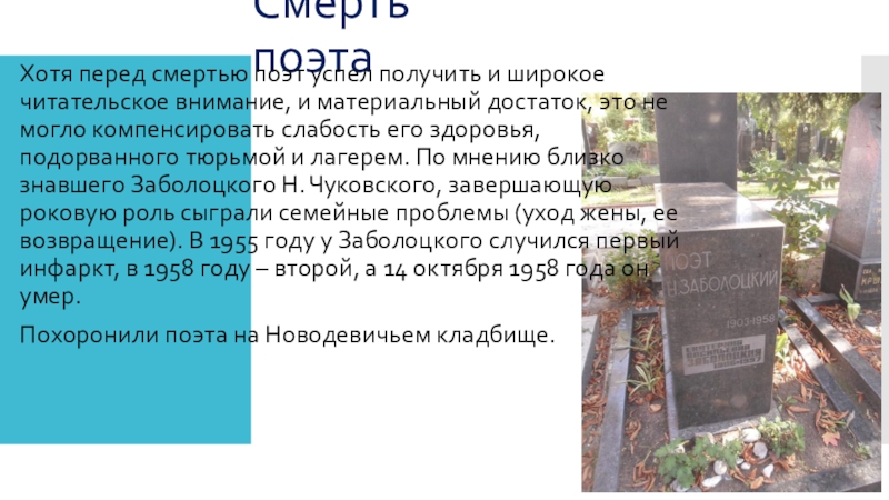 и материальный достаток, это не могло компенсировать слабость его здоровья, подорванного тюрьмой и лагерем. По мнению близко знавшего Заболоцкого Н. Чуковского, завершающую роковую роль сыграли семейные проблемы (уход жены, ее возвращение). В 1955 году у Заболоцкого случился первый инфаркт, в 1958 году – второй, а 14 октября 1958 года он умер.