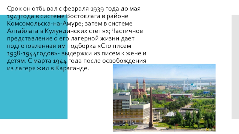 Слайд 10Срок он отбывал с февраля 1939 года до мая 1943года в