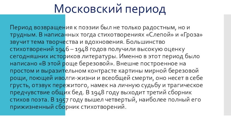 трудным. В написанных тогда стихотворениях «Слепой» и «Гроза» звучит тема творчества и вдохновения. Большинство стихотворений 1946 – 1948 годов получили высокую оценку сегодняшних историков литературы. Именно в этот период было написано «В этой роще березовой». Внешне построенное на простом и выразительном контрасте картины мирной березовой рощи, поющей иволги-жизни и всеобщей смерти, оно несет в себе грусть, отзвук пережитого, намек на личную судьбу и трагическое предчувствие общих бед. В 1948 году выходит третий сборник стихов поэта. В 1957 году вышел четвертый, наиболее полный его прижизненный сборник стихотворений.