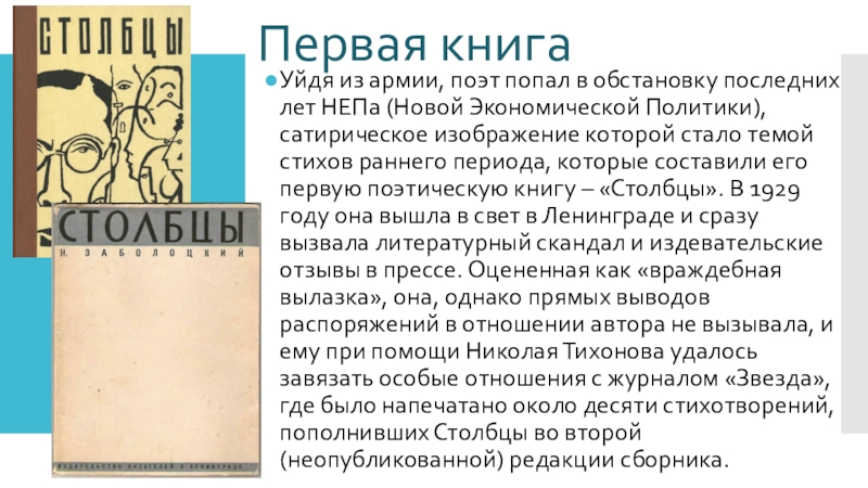 (Новой Экономической Политики), сатирическое изображение которой стало темой стихов раннего периода, которые составили его первую поэтическую книгу – «Столбцы». В 1929 году она вышла в свет в Ленинграде и сразу вызвала литературный скандал и издевательские отзывы в прессе. Оцененная как «враждебная вылазка», она, однако прямых выводов распоряжений в отношении автора не вызывала, и ему при помощи Николая Тихонова удалось завязать особые отношения с журналом «Звезда», где было напечатано около десяти стихотворений, пополнивших Столбцы во второй (неопубликованной) редакции сборника.