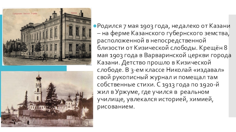 Казанского губернского земства, расположенной в непосредственной близости от Кизической слободы. Крещён 8 мая 1903 года в Варваринской церкви города Казани. Детство прошло в Кизической слободе. В 3-ем классе Николай «издавал» свой рукописный журнал и помещал там собственные стихи. С 1913 года по 1920-й жил в Уржуме, где учился в реальном училище, увлекался историей, химией, рисованием.