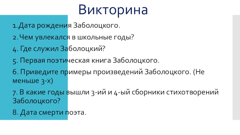 6. Приведите примеры произведений Заболоцкого. (Не меньше 3-х)
