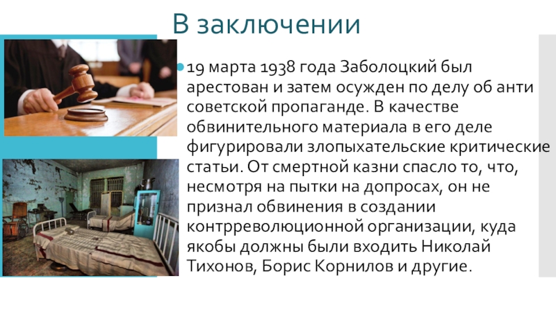19 марта 1938 года Заболоцкий был арестован и затем осужден