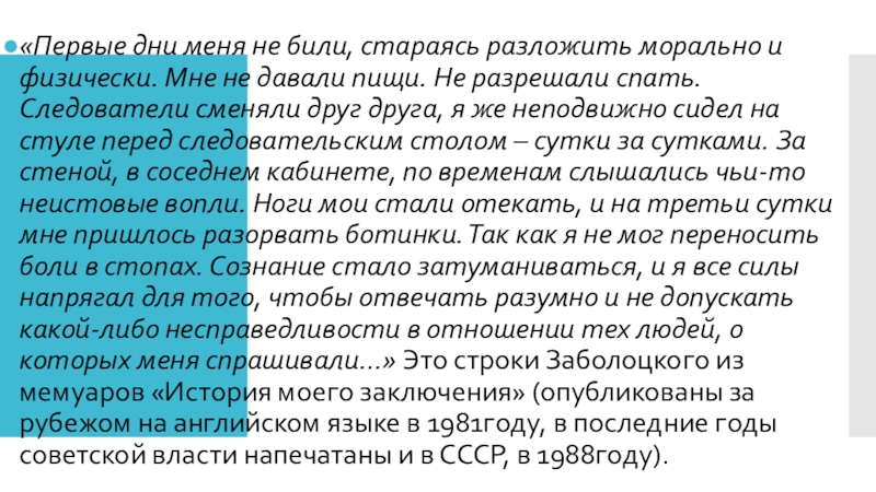 Слайд 9«Первые дни меня не били, стараясь разложить морально и физически. Мне
