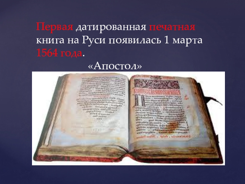 Слайд 12Первая датированная печатная книга на Руси появилась 1 марта 1564 года.