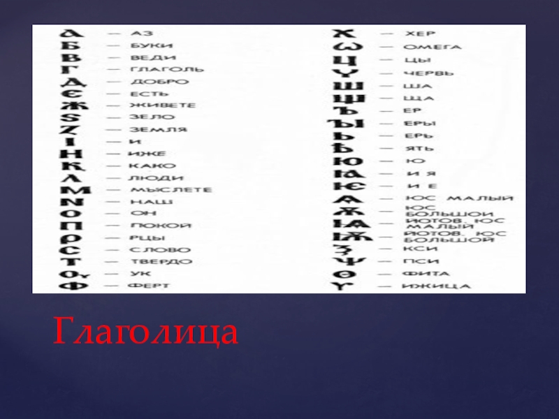 Слайд 4Глаголица – одна из первых словянских азбук.