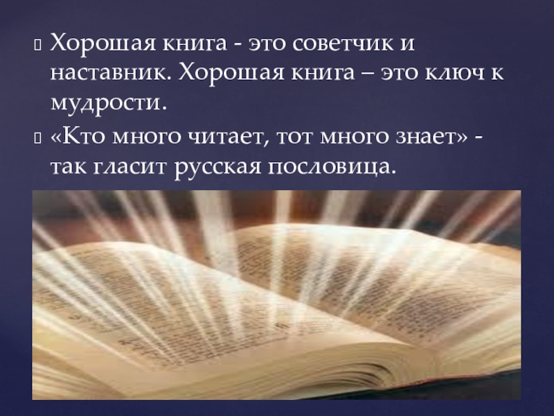 Хорошая книга - это советчик и наставник. Хорошая книга – это ключ к мудрости. «Кто много читает,