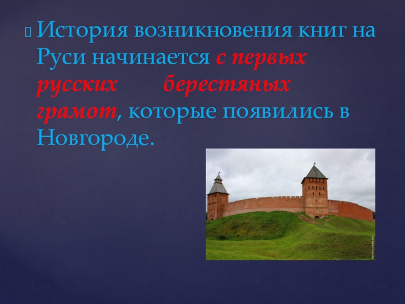 История возникновения книг на Руси начинается с первых русских    берестяных грамот, которые появились в