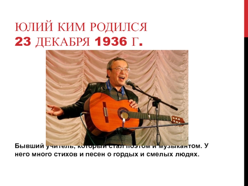 Юлий Ким родился 23 декабря 1936 г. Бывший учитель, который стал поэтом и музыкантом. У него много