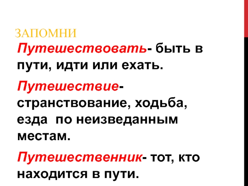 ЗапомниПутешествовать- быть в пути, идти или ехать.Путешествие- странствование, ходьба, езда по неизведанным местам.Путешественник- тот, кто находится в