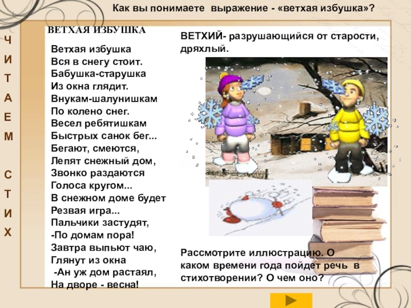 Рассмотрите иллюстрацию. О каком времени года пойдет речь в стихотворении? О чем оно?