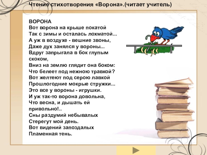 Вон желтеют под серою лавкой Прошлогодние мокрые стружки... Это все у вороны - игрушки. И уж так-то ворона довольна, Что весна, и дышать ей привольно!..