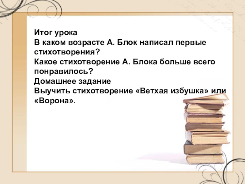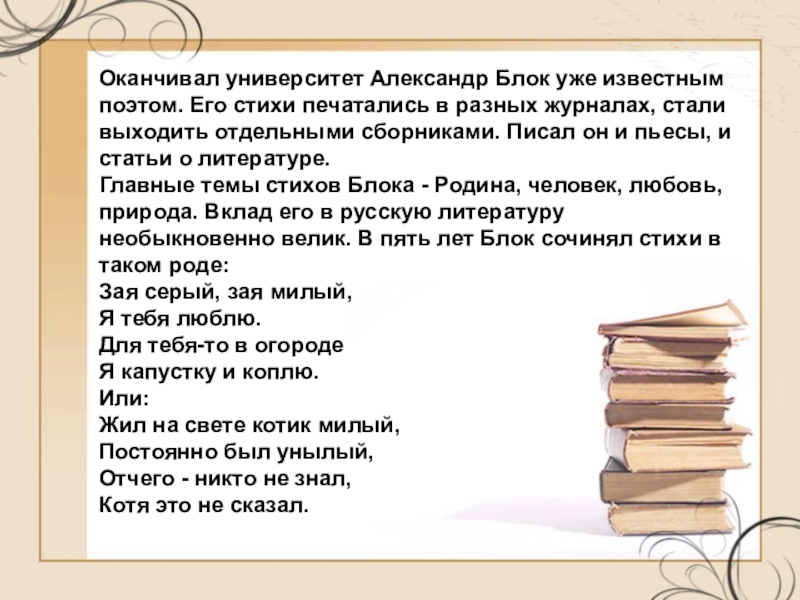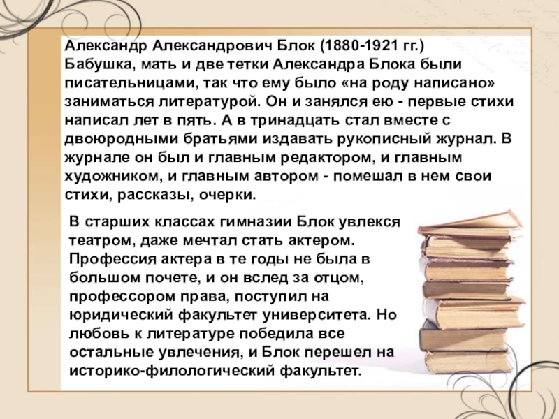 Бабушка, мать и две тетки Александра Блока были писательницами, так что ему было «на роду написано» заниматься литературой. Он и занялся ею - первые стихи написал лет в пять. А в тринадцать стал вместе с двоюродными братьями издавать рукописный журнал. В журнале он был и главным редактором, и главным художником, и главным автором - помешал в нем свои стихи, рассказы, очерки.