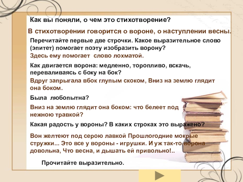 Перечитайте первые две строчки. Какое выразительное слово(эпитет) помогает поэту изобразить ворону?