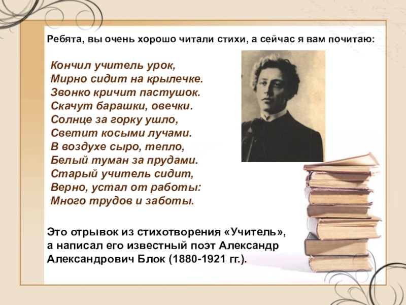 Это отрывок из стихотворения «Учитель», а написал его известный поэт Александр Александрович Блок (1880-1921 гг.).