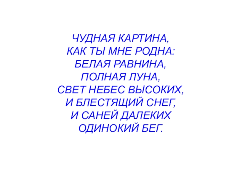 Слайд 5Чудная картина, Как ты мне родна: Белая равнина, Полная луна, Свет небес высоких, И блестящий снег, И