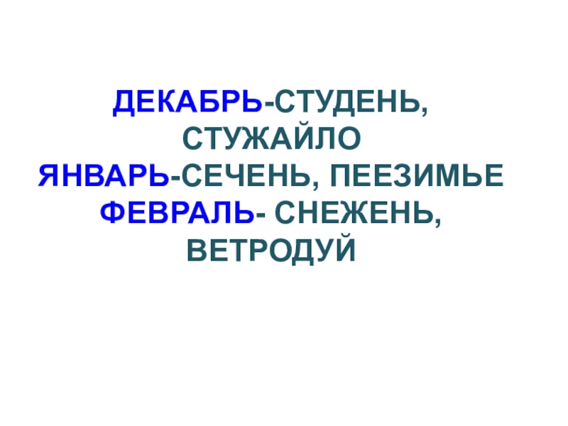 Слайд 12Декабрь-студень, стужайло Январь-Сечень, пеезимье Февраль- снежень, ветродуй