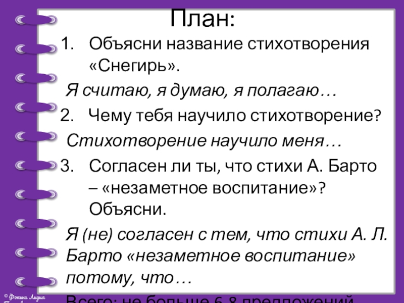План:Объясни название стихотворения «Снегирь». Я считаю, я думаю, я полагаю…Чему тебя научило стихотворение? Стихотворение научило меня…Согласен ли