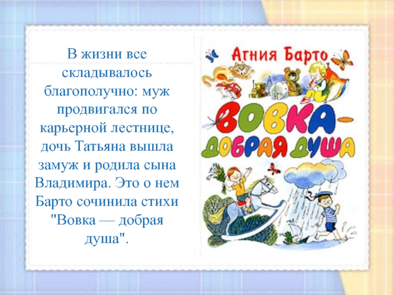 Татьяна вышла замуж и родила сына Владимира. Это о нем Барто сочинила стихи "Вовка — добрая душа".