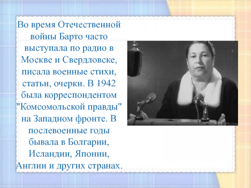 Слайд 4Во время Отечественной войны Барто часто выступала по радио в Москве