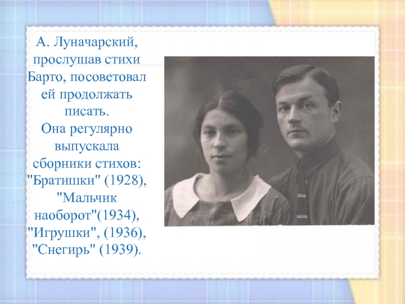 Слайд 3А. Луначарский, прослушав стихи Барто, посоветовал ей продолжать писать. Она регулярно
