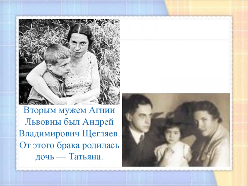 Слайд 6Вторым мужем Агнии Львовны был Андрей Владимирович Щегляев. От этого брака