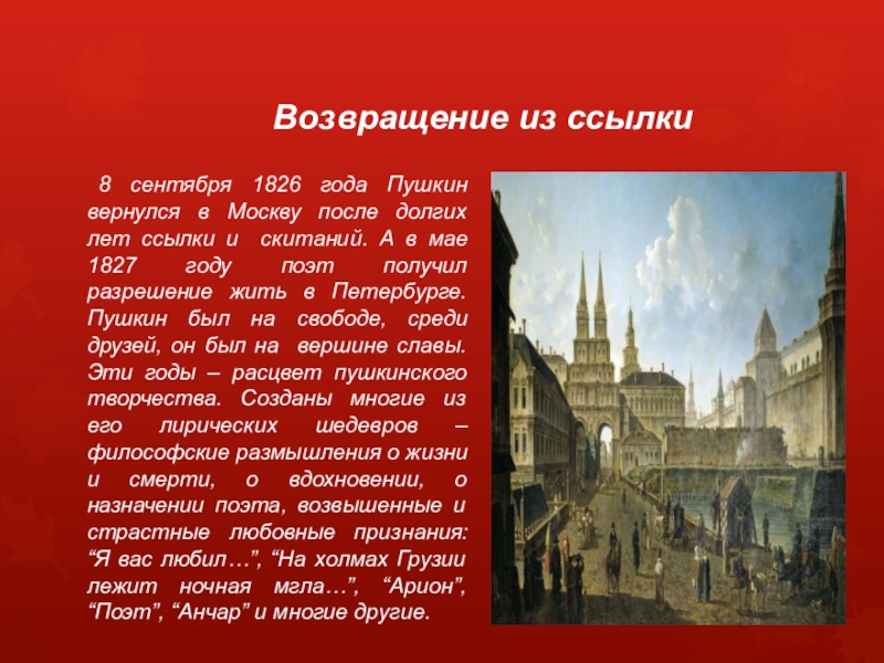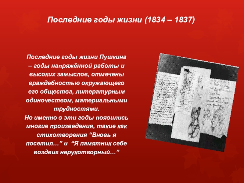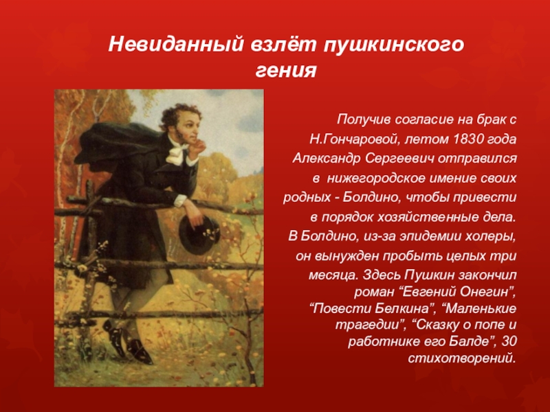 Поэт полон поэтических замыслов и свершений. Особое место в творчестве занимает историческая тема (“История Пугачёва”, “Капитанская дочка”).